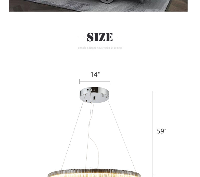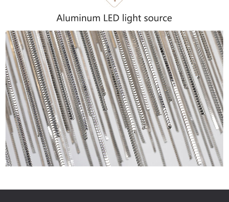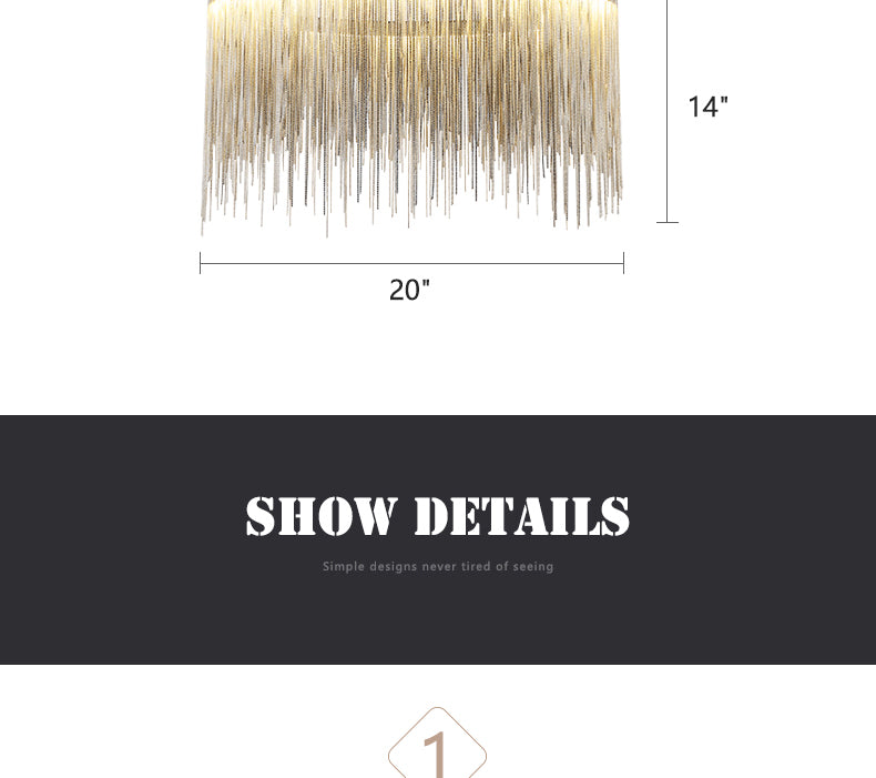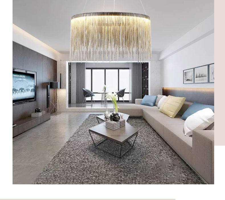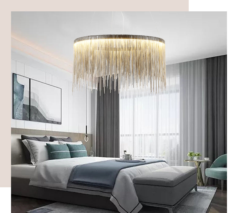 • Material: Polished chrome stainless steel base and rod; Aluminum delicate chain. Style: Elegant round linear fringe pendant light.